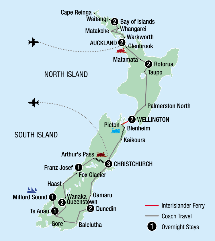 Experience the romance of rail travel, the majesty of cruising and the luxury of coach travel on this 19-day New Zealand tour. Visiting both  the North and South Islands, enjoy scenic rail journeys onboard the Glenbrook Vintage Railway, Coastal Pacific Rail Journey and the world-renowned TranzAlpine Rail Journey. Relax on 4 cruises featuring an overnight cruise on the beautiful Milford Sound. Enjoy 2-night stays in the Bay of Islands, Rotorua, Wellington, Christchurch, Queenstown and Dunedin. Enjoy the comfort of travelling in a mid-size group of up to 32 travellers, fully escorted.